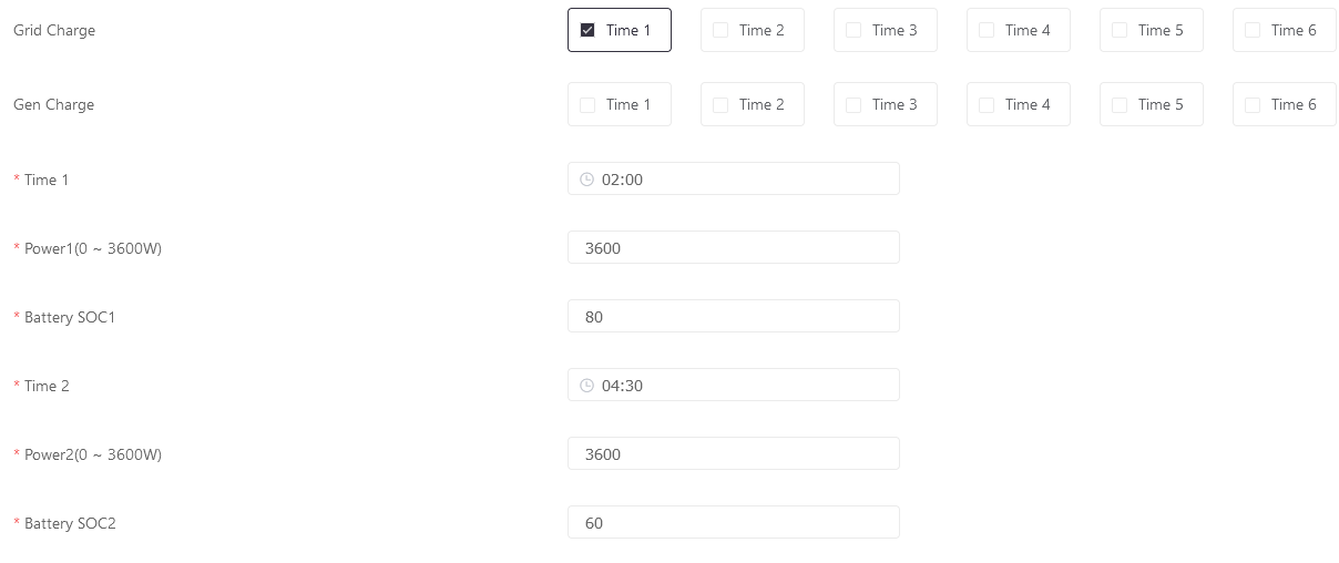 Time 1 to 6 - if Time 1 is ticked then this will mean that the batteries will be set to charge from the grid, if the Time 2 is un-ticked then the battery will not charge from the grid. - in order to charge from the grid the time period should be ticked in which you would like to charge from Gen Charge Times